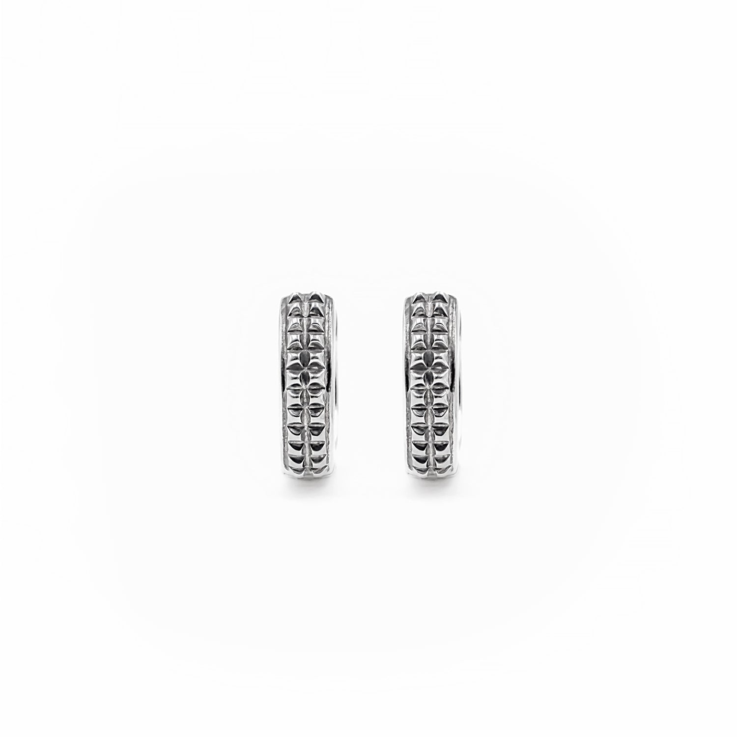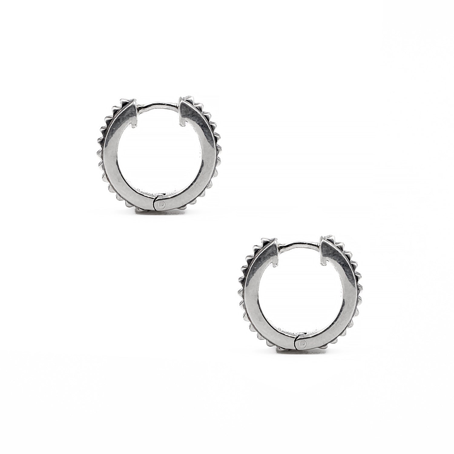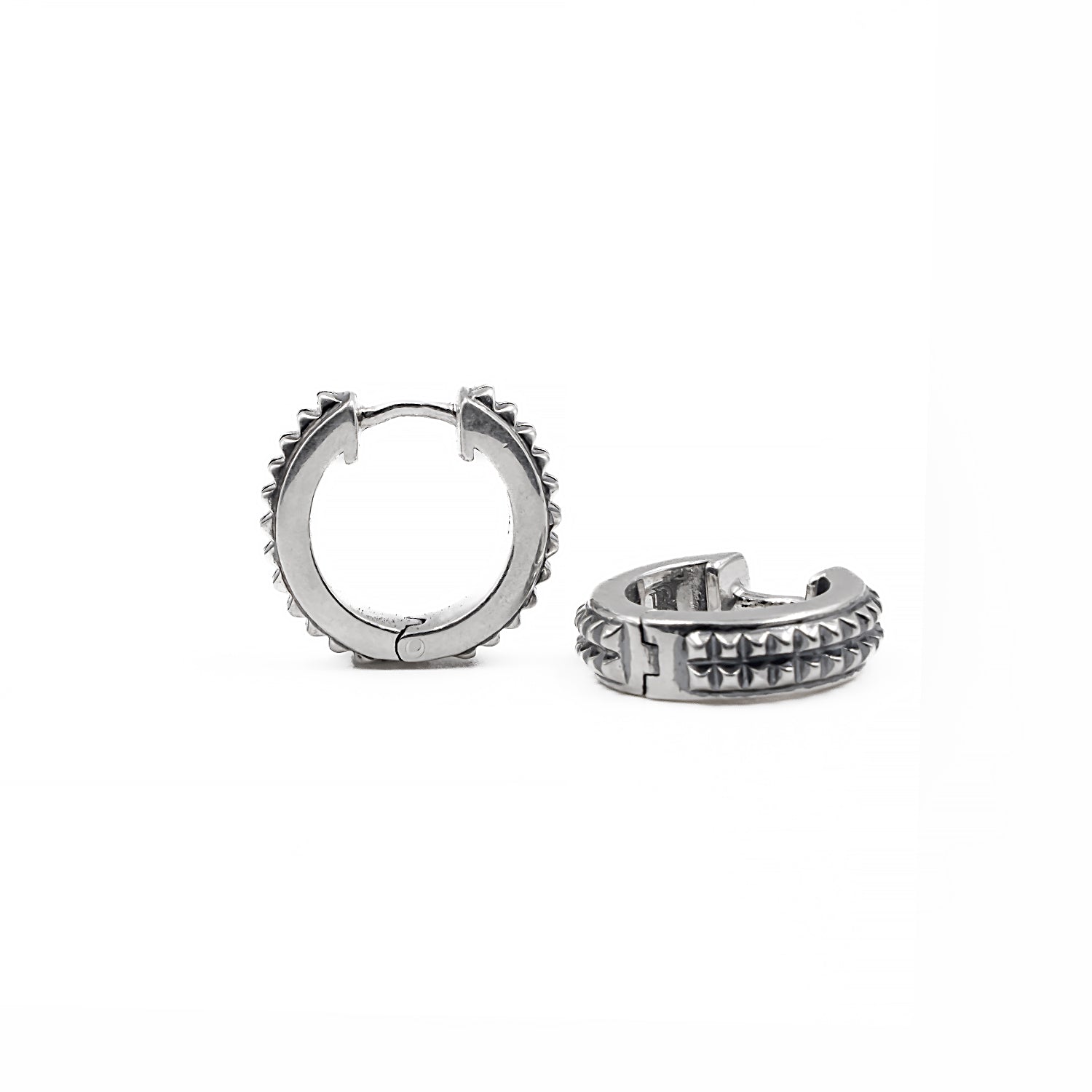 Set in parallel rows, little pyramids traverse the front of these bold 925 sterling silver hoops.