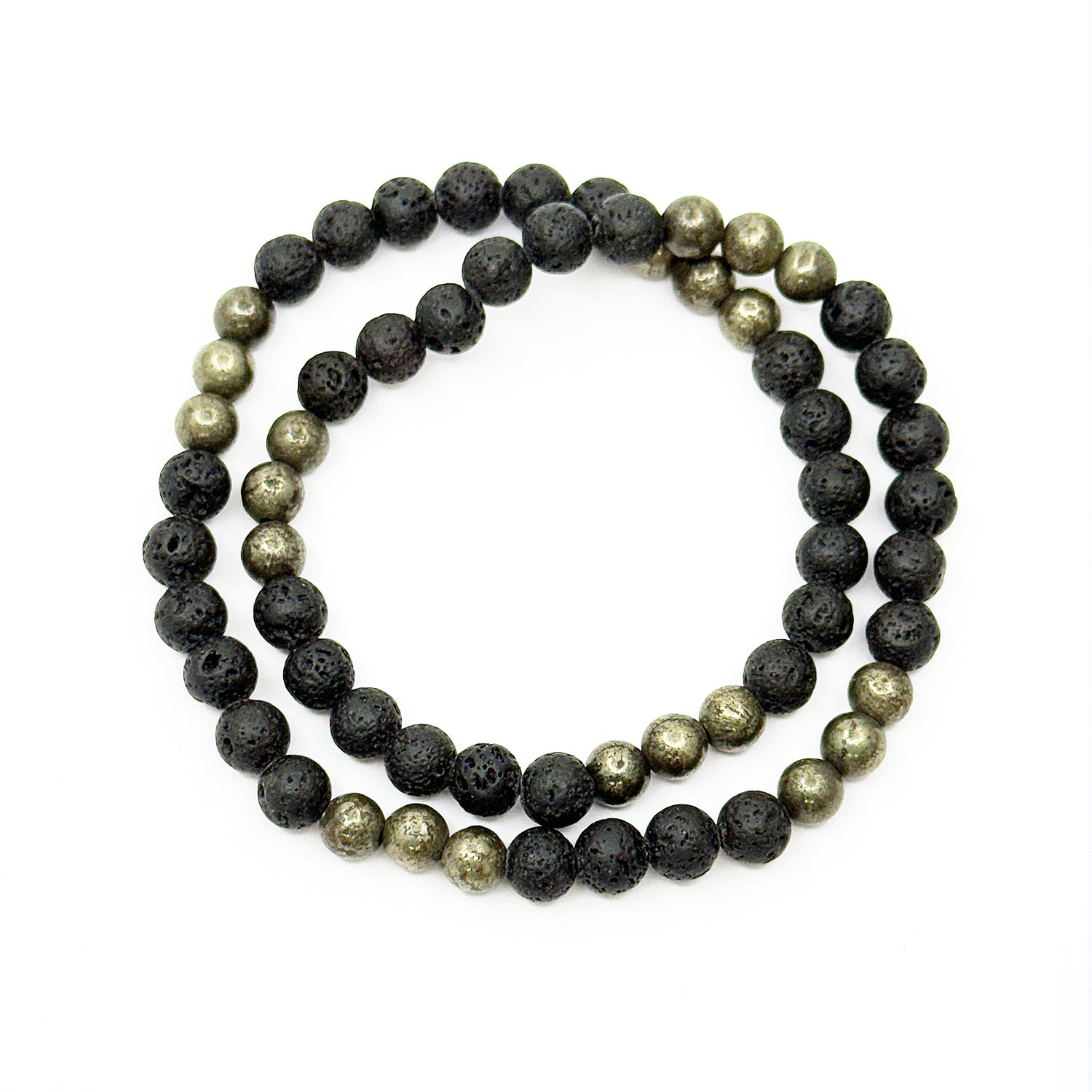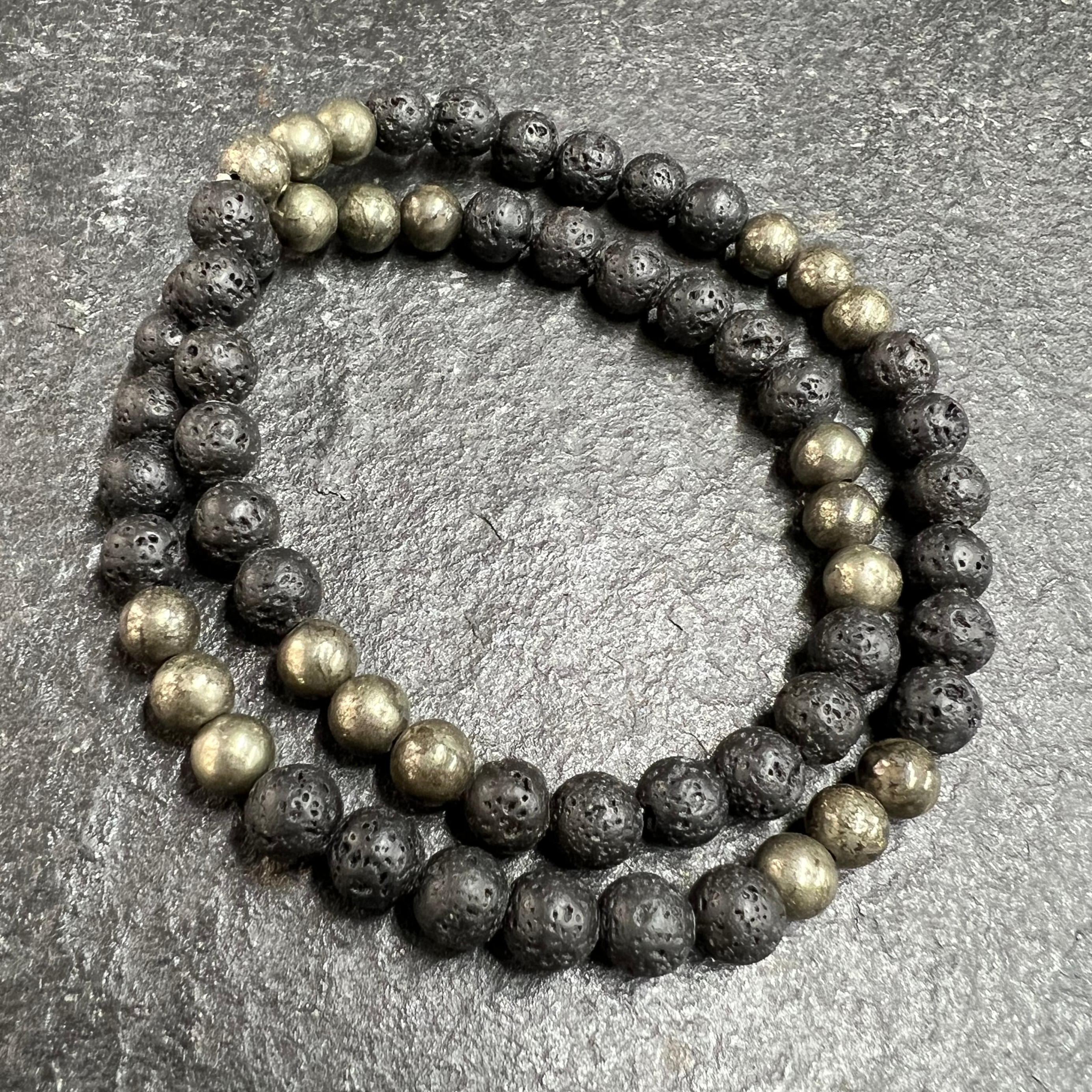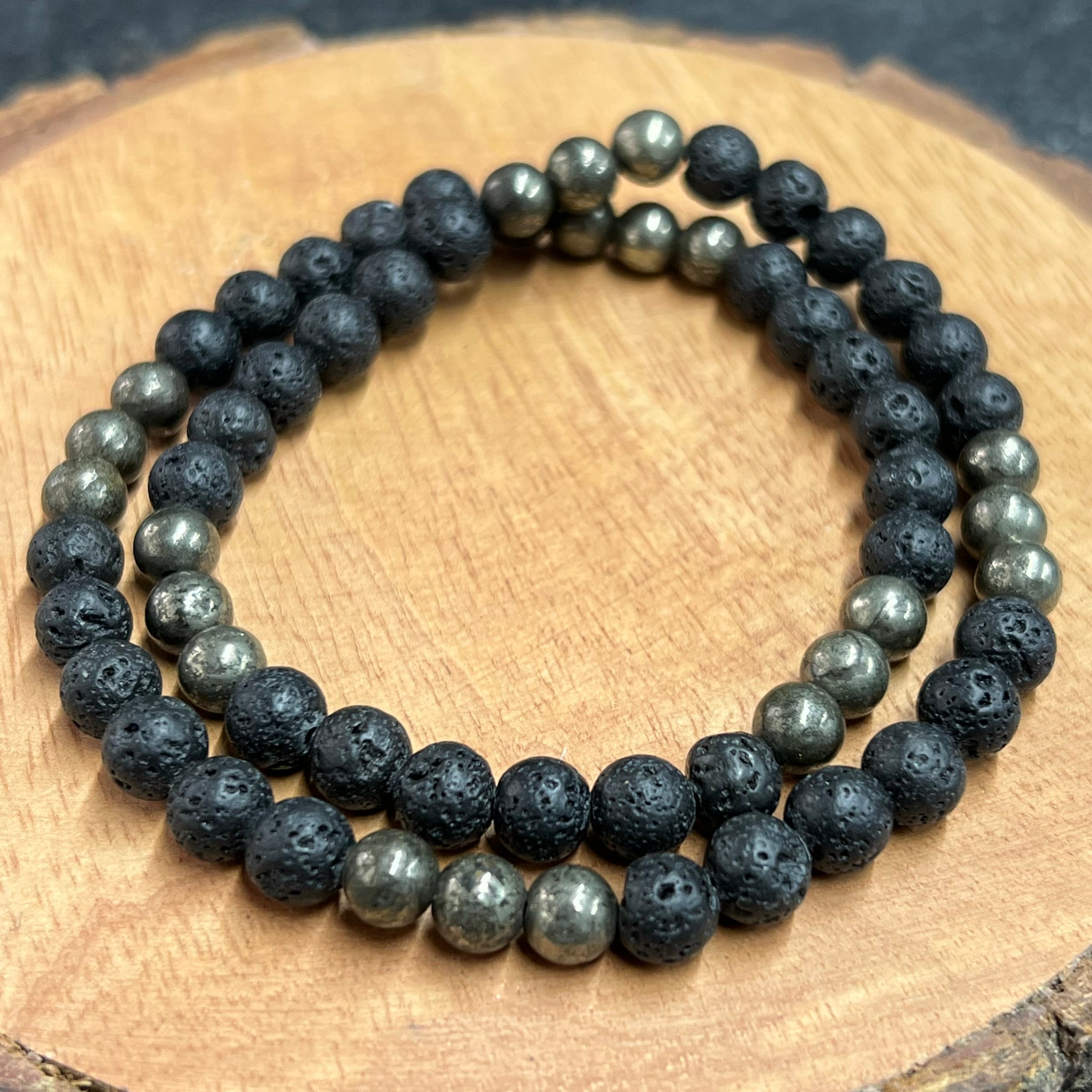 This 6mm wrap bracelet features lava and pyrite beads, creating a stunning natural stone combination.