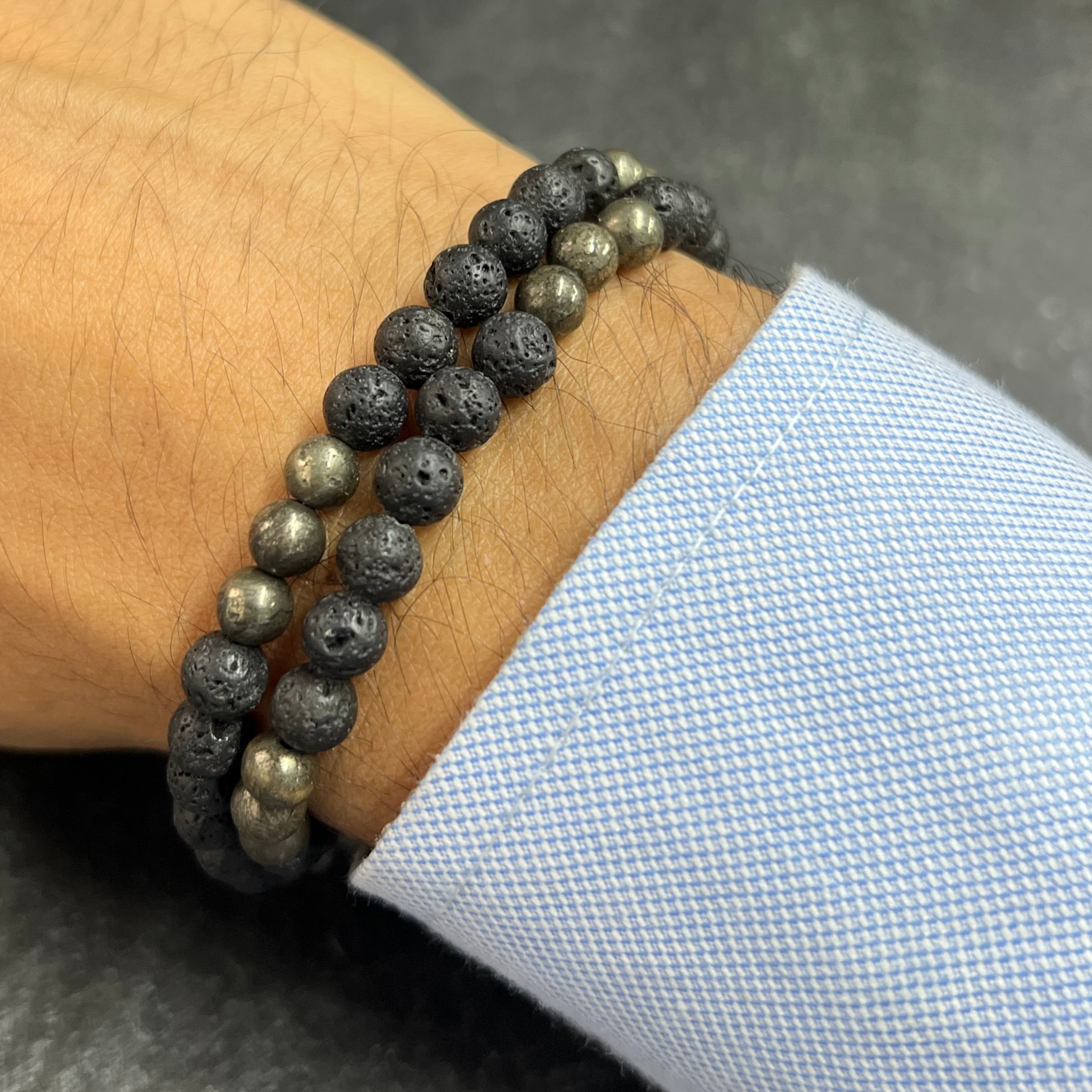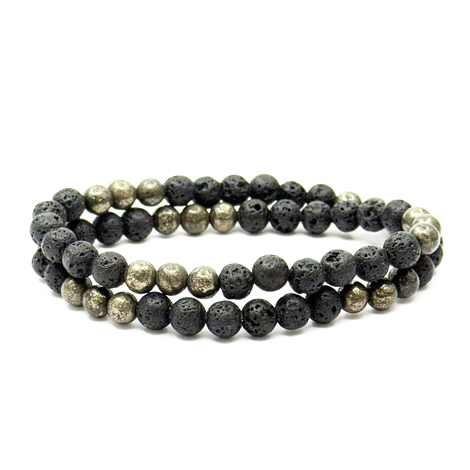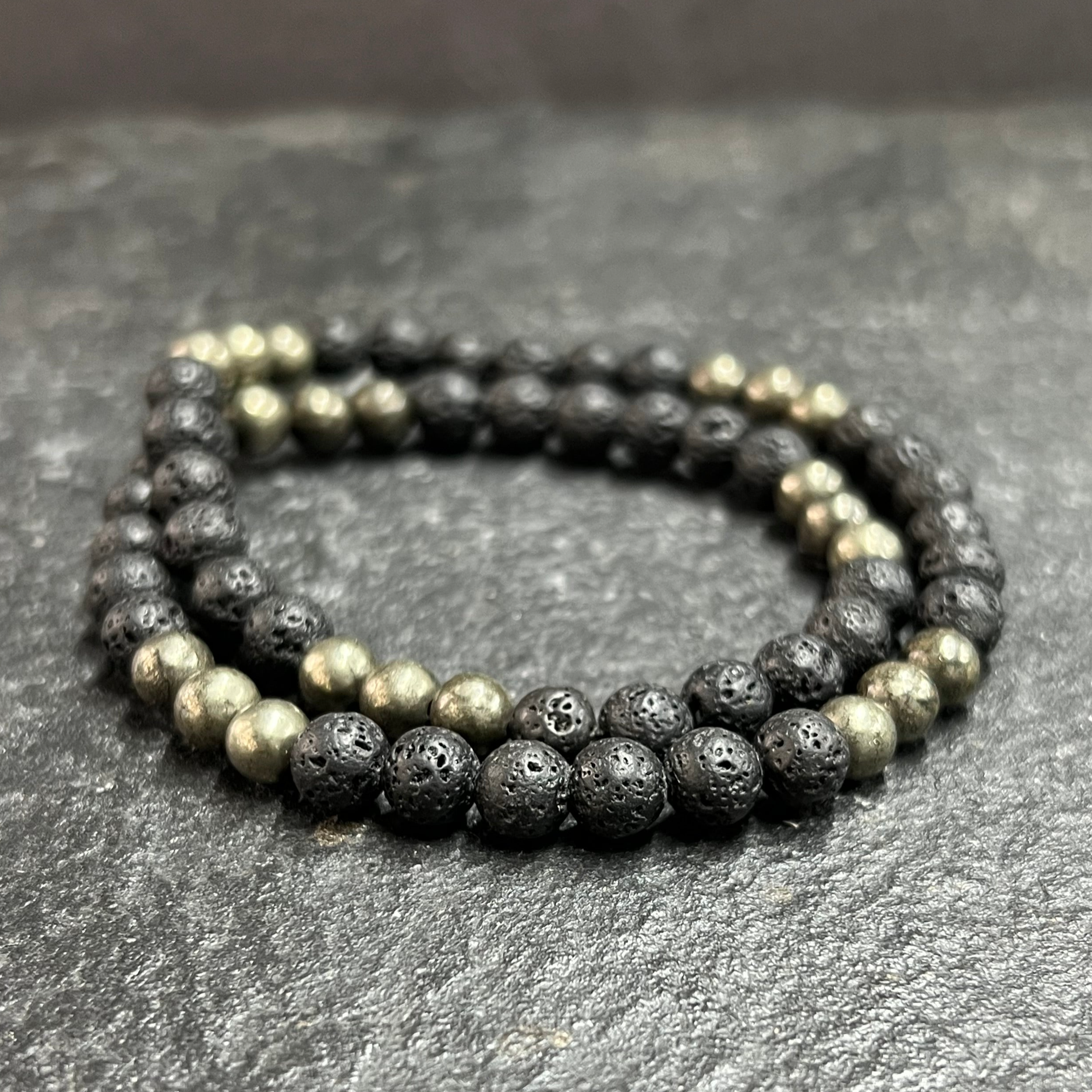 This 6mm wrap bracelet features lava and pyrite beads, creating a stunning natural stone combination.