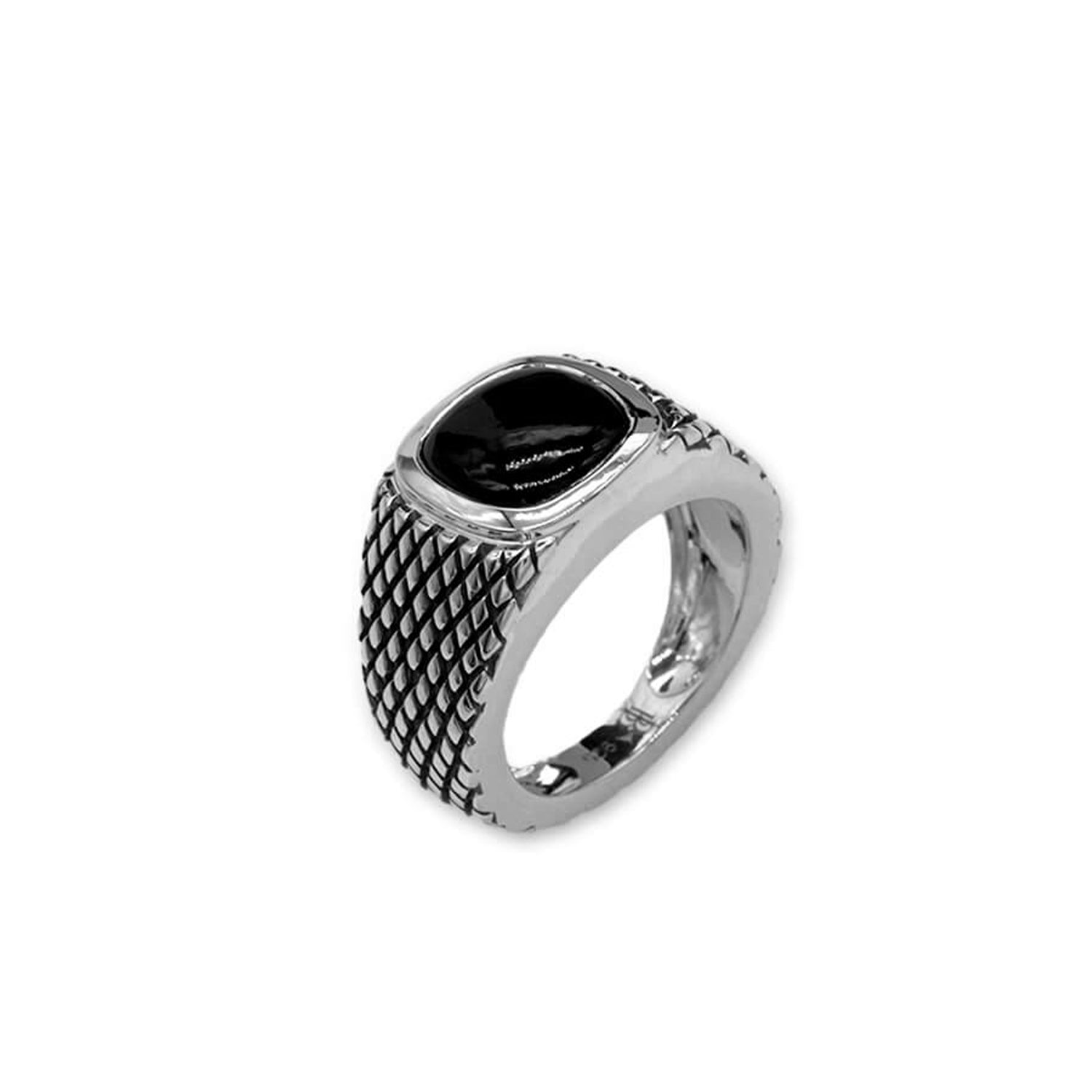 Chequered Signet Ring with Black Onyx Gemstone, in 925 Sterling Silver