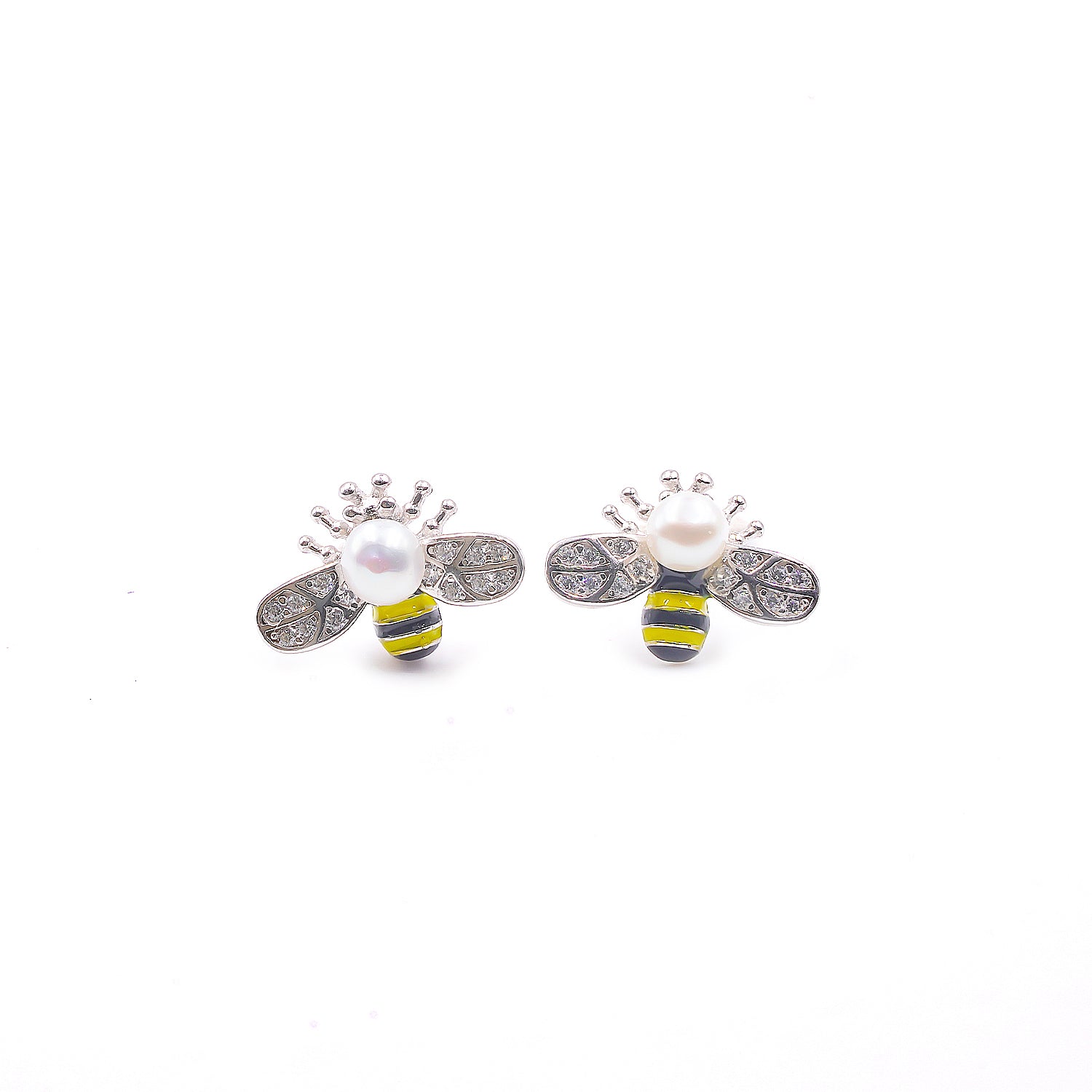 The bees are beautifully detailed with black and yellow enamel stripes, complemented by synthetic pearl.