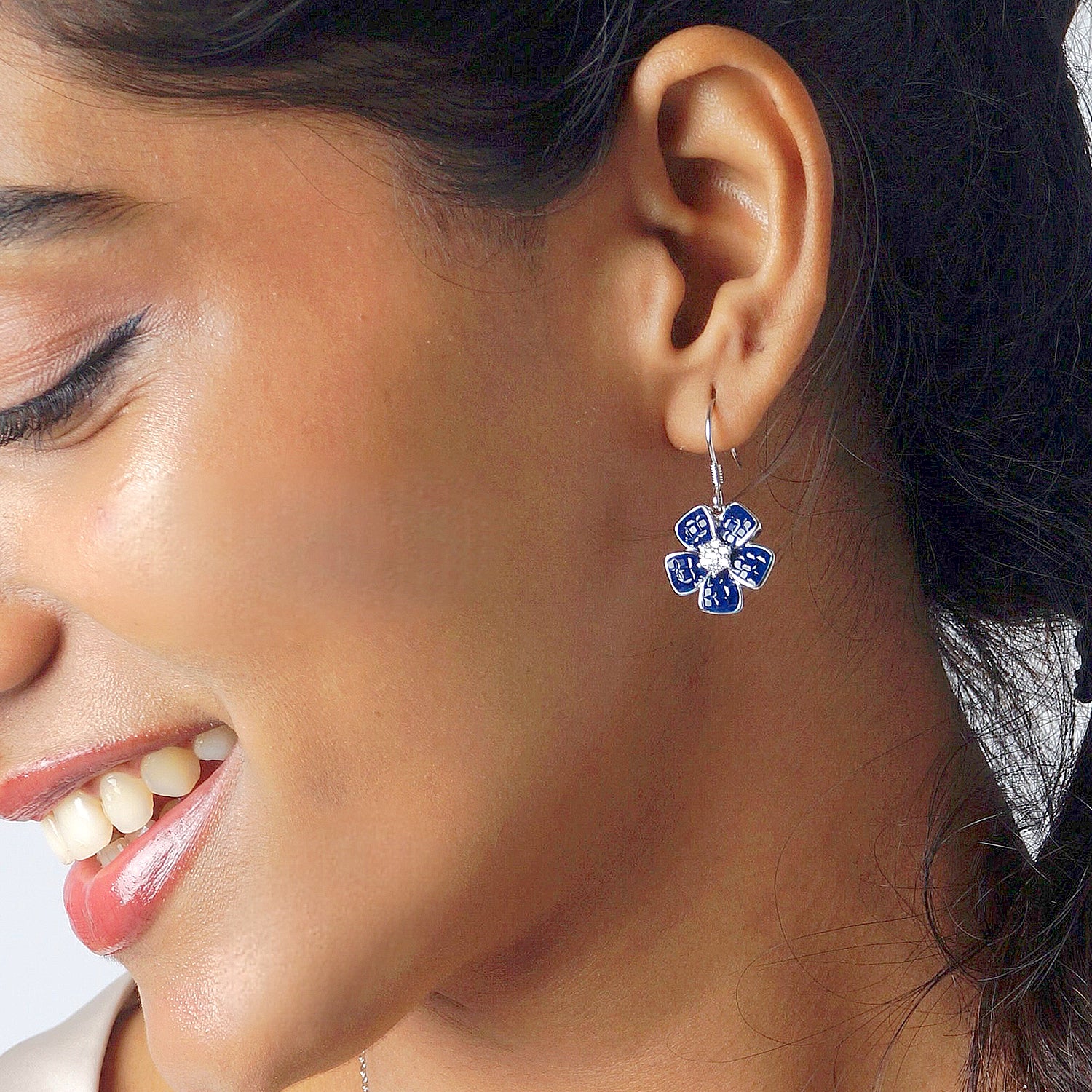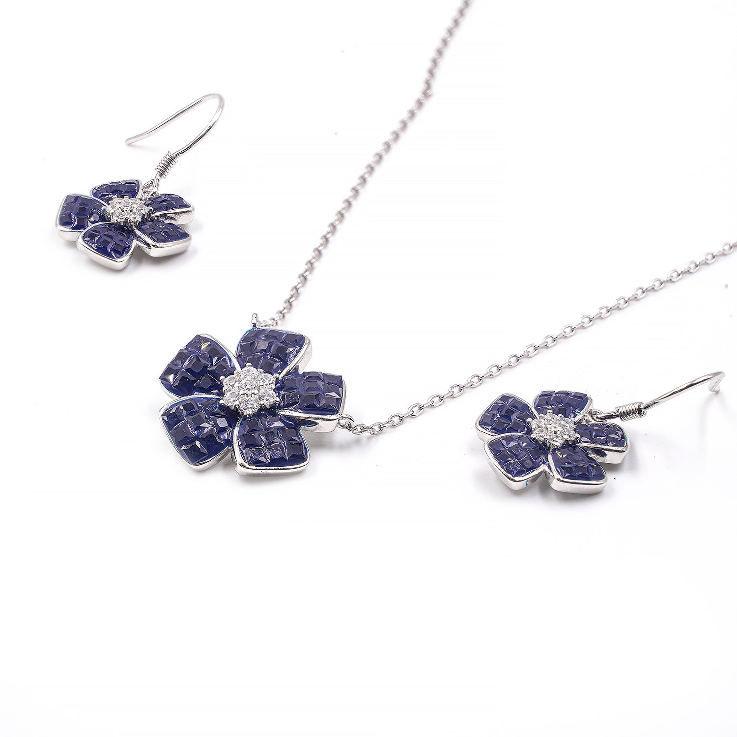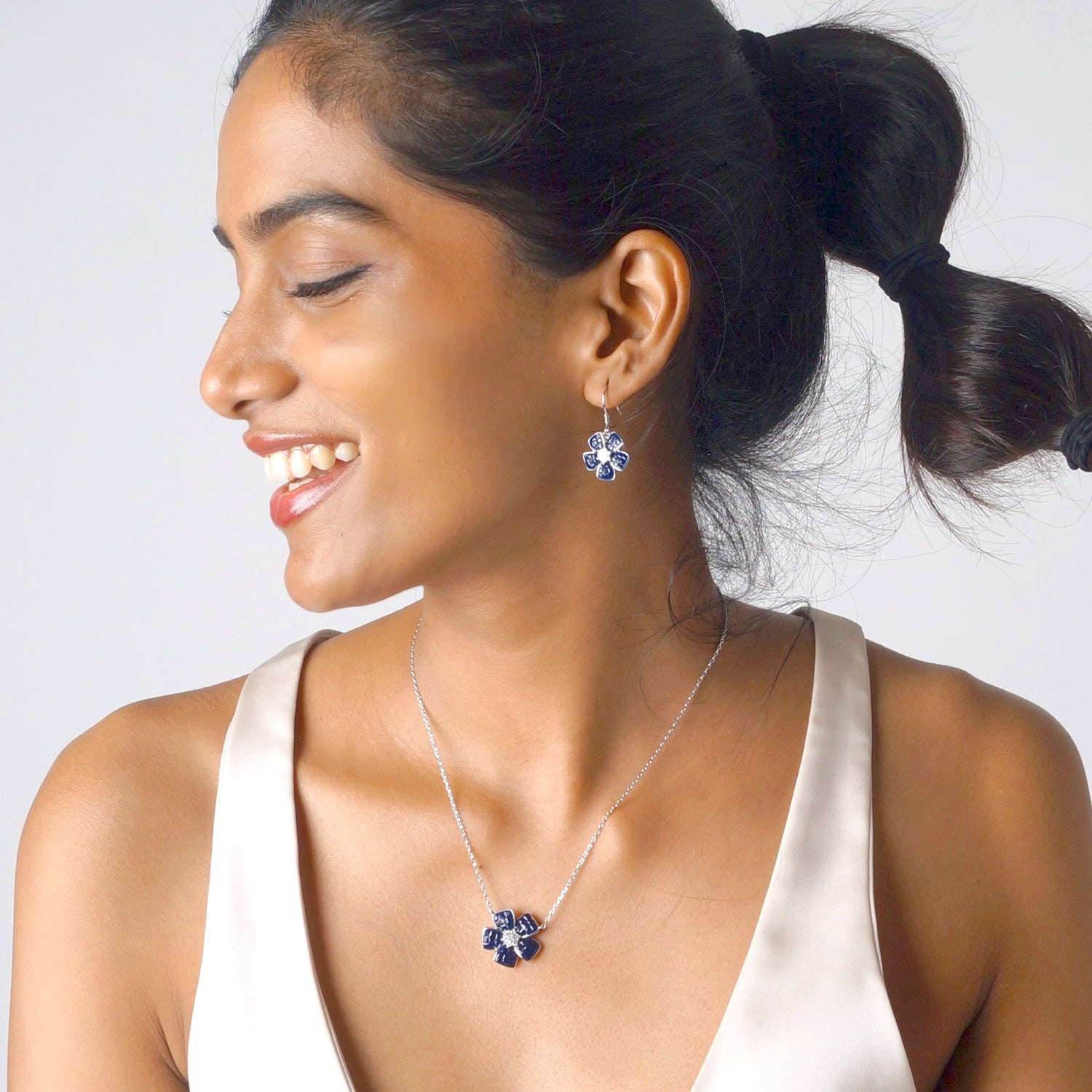 This elegant Floral Sapphire Earrings and Pendant Set is crafted from high-quality 925 sterling silver, featuring a beautiful floral design with deep blue sapphire cubic zirconia petals accented by sparkling clear stones at the center. The pendant hangs delicately from a classic cable chain, while the earrings are secured with comfortable fish hook locks, ensuring ease of wear.