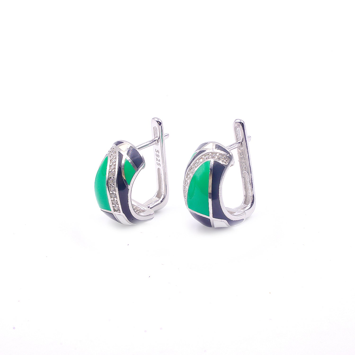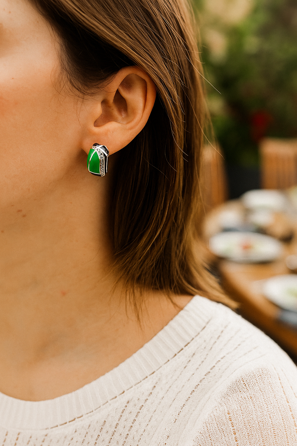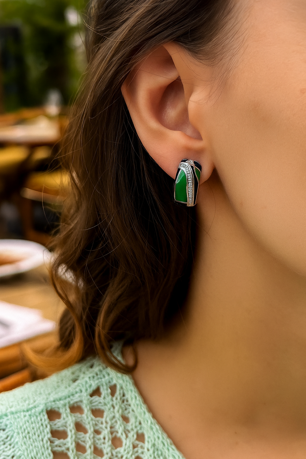 Elevate your style with these bold and elegant Italian Enamel High Top Earrings, crafted from premium 925 Sterling Silver. Featuring a modern mix of vibrant green and black & white enamel detailing, these earrings are accented with a row of sparkling micro-set synthetic diamonds for added brilliance. Their sleek curve and high-polish finish give them a luxurious, contemporary look.